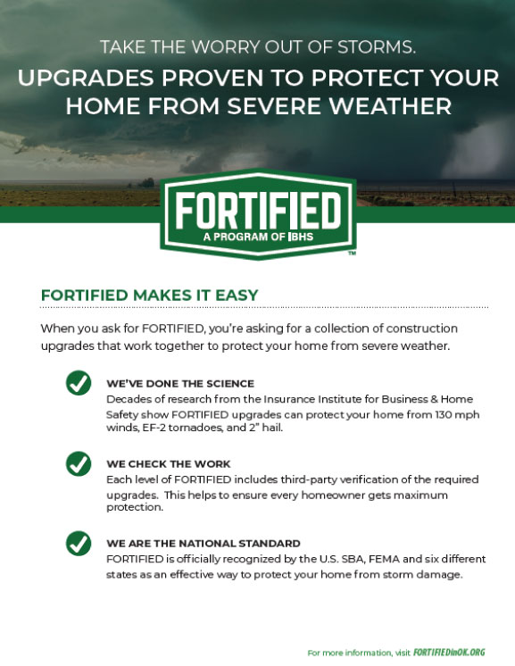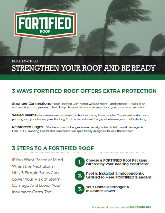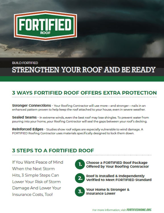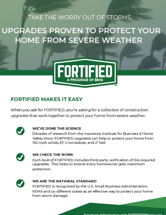 FORTIFIED is a voluntary construction and re-roofing Program designed to strengthen homes and commercial buildings against specific types of severe weather such as high winds, hail, hurricanes and even tornadoes.